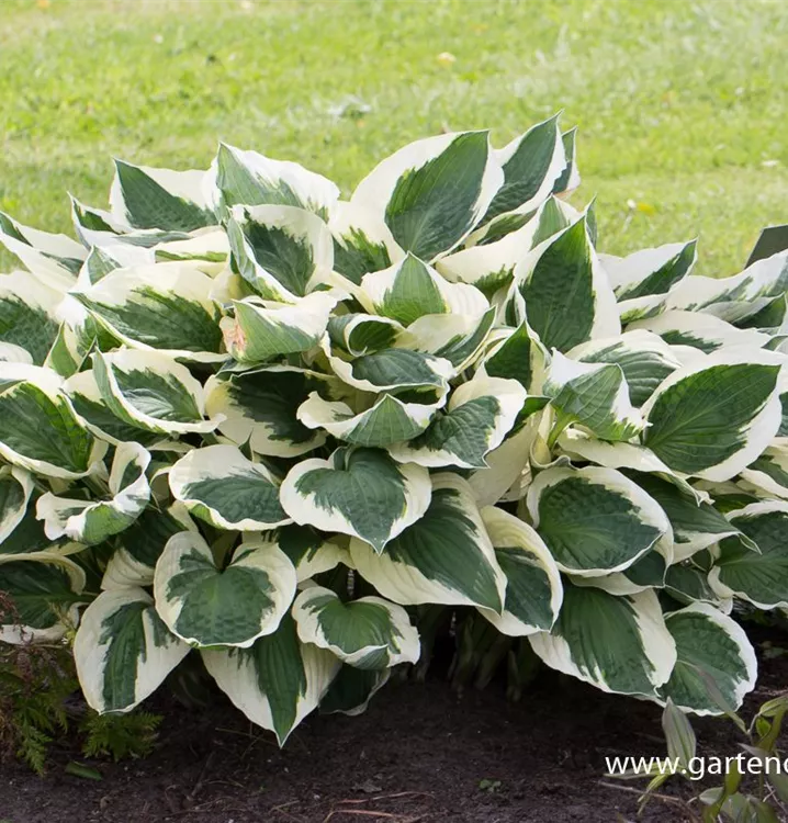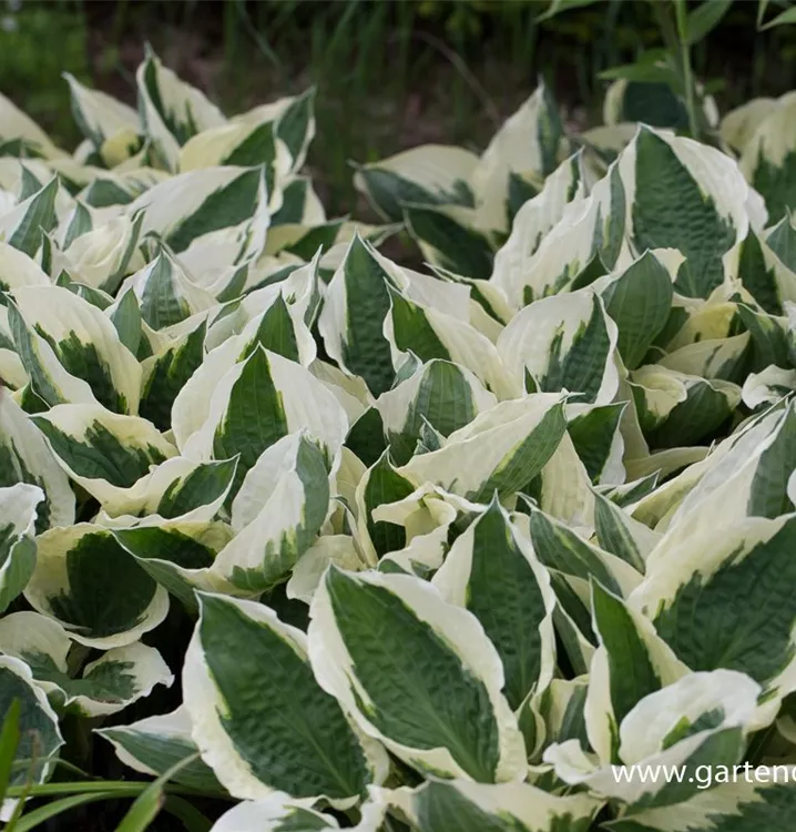 Die Graublättrige Goldrand-Garten-Funkie 'Patriot' (Hosta x fortunei) ist eine horstbildende, aufrechte, buschige, breite Staude mit dekorativen, lanzettlichen, herzförmigen, dunkelgrünen Blättern. An einem halbschattigen Standort mit durchlässigem, humosem Boden erreicht sie gewöhnlich eine Höhe von ca. 50 cm und wird ca. 50 cm breit. Die Graublättrige Goldrand-Garten-Funkie 'Patriot' ist gut frostverträglich.