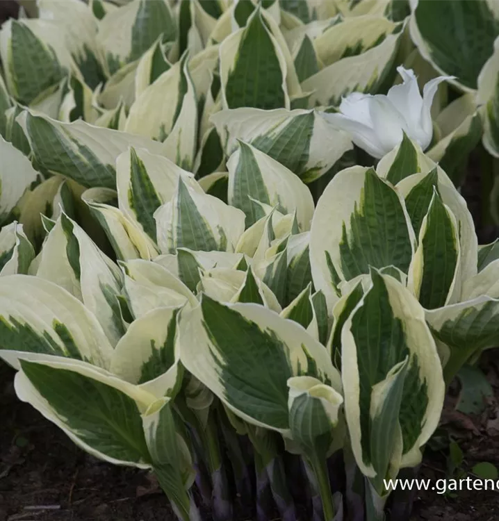 Hoher Blattschmuckwert. Die sommergrünen Blätter der Graublättrige Goldrand-Garten-Funkie 'Patriot' sind dunkelgrün, lanzettlich, herzförmig, grundständig, ganzrandig und weisen einen weißen Rand auf. Graublättrige Goldrand-Garten-Funkie 'Patriot' zeigt sich leuchtend gelb im Herbst.