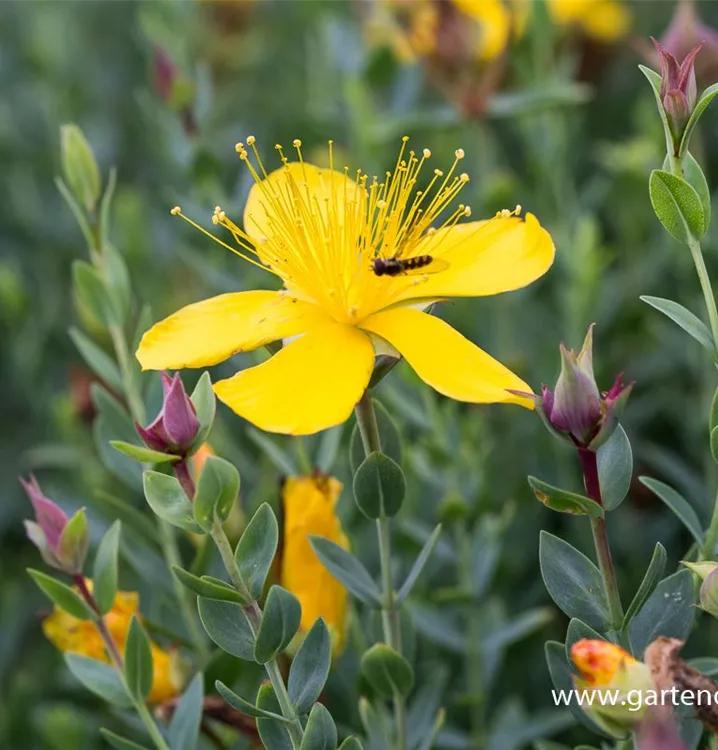 Hypericum polyphyllum 'Grandiflorum' bildet schalenförmige, in Dolden angeordnete, gelbe Blüten ab Juni.