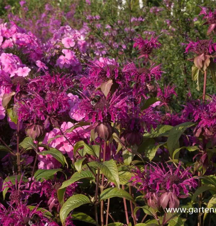 Monarda fistulosa 'On Parade' bildet lippenförmige, in Quirle angeordnete, rote Blüten ab Juli.