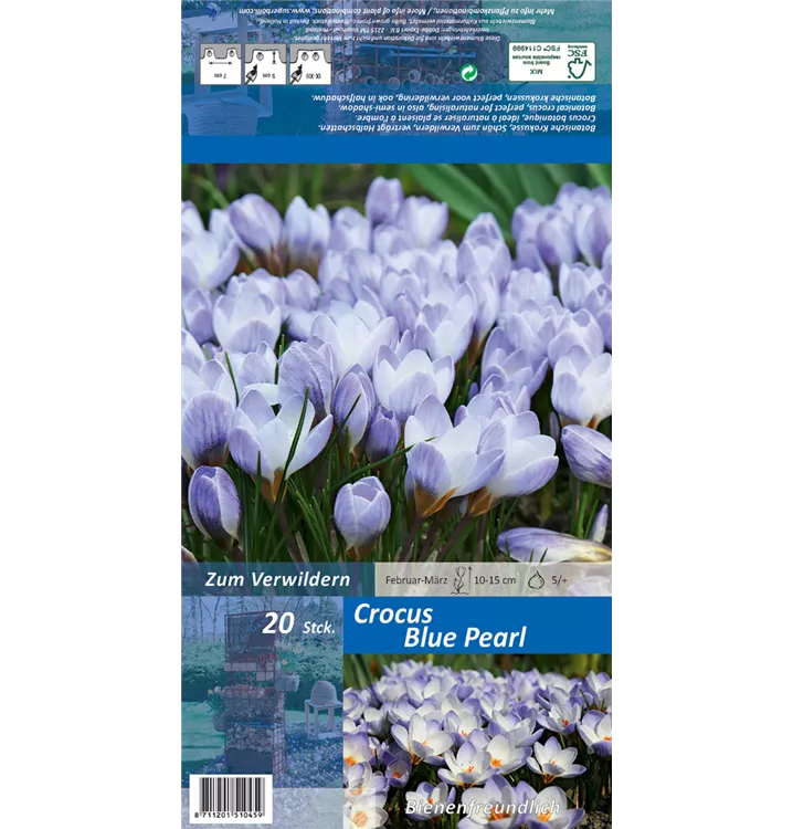 Welch eine Pracht, wenn der Kleine Garten-Krokus 'Blue Pearl' ab Februar seine herrlichen, hellblauen Blüten hervorbringt! Über den dunkelgrünen Blättern kommen die Blüten besonders gut zur Geltung. Wird Crocus chrysanthus 'Blue Pearl' an einen sonnigen Standort mit durchlässigem Boden gepflanzt, entwickelt er sich besonders gut. Er wächst aufrecht und erreicht Größen von 8 cm bis 10 cm bei einer Breite von 6 cm bis 8 cm. Sehr dekorativ macht sich der Kleine Garten-Krokus 'Blue Pearl' auch in Kübeln oder Kästen.