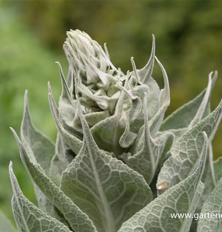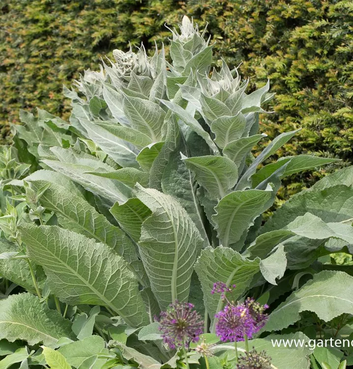 Die wintergrünen Blätter der Garten-Königskerze 'Wega' sind dunkelgrün, breit lanzettlich.