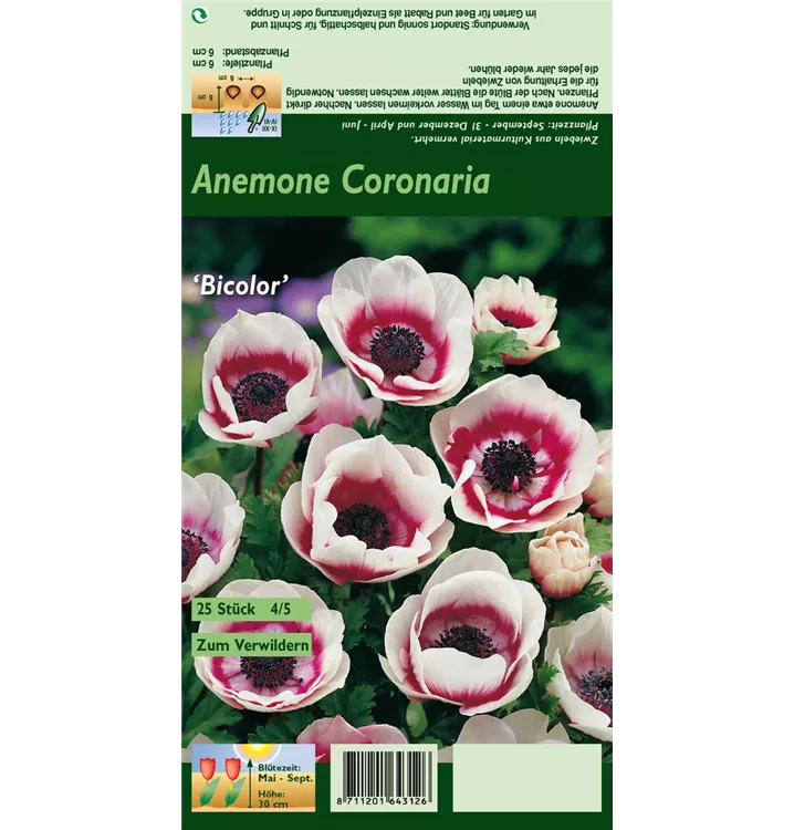 Die beste Pflanzzeit für Anemone coronaria 'De Caen Bicolor' ist September - Dezember oder April - Mai.