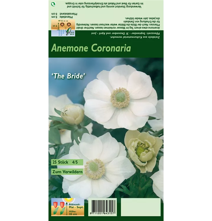 Die beste Pflanzzeit für Anemone coronaria 'De Caen The Bride' ist September - Dezember oder April - Mai.
