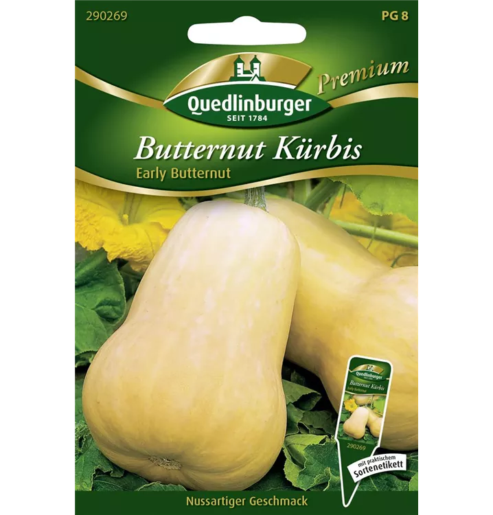 Der Kürbis 'Early Butter Nut F1' (Cucurbita moschata) bildet Früchte, die aromatisch schmecken und bereits ab August geerntet werden können. Für das optimale Wachstum des Kürbises 'Early Butter Nut F1' werden ein sonniger Standort und durchlässiger, nährstoffreicher Boden benötigt.