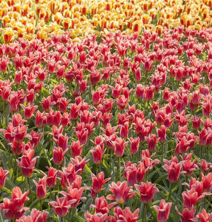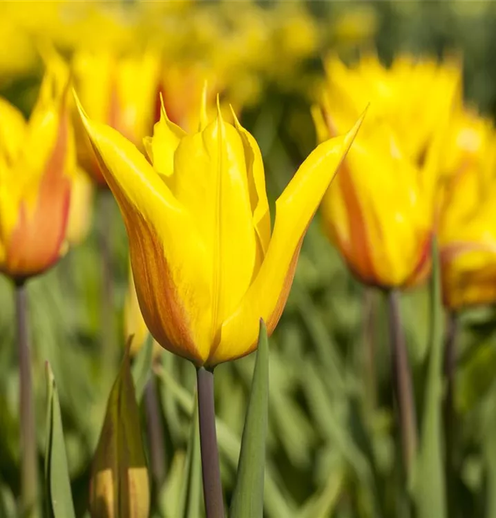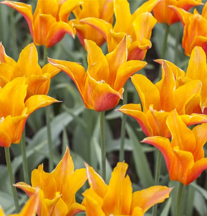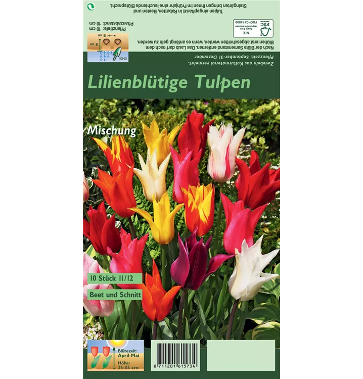 Welch eine Pracht, wenn die Lilienblütige Tulpe ab April ihre herrlichen, bunten Blüten hervorbringt! Das Besondere: sie verbreiten einen angenehmen Duft. Über den dunkelgrünen, linealen Blättern kommen die Blüten besonders gut zur Geltung. Wird Tulipa lilienblütig an einen sonnigen Standort mit durchlässigem, lockerem und nährstoffreichem Boden gepflanzt, entwickelt sie sich besonders gut. Sie wächst schlank, aufrecht und erreicht Größen von 50 cm bis 55 cm bei einer Breite von 8 cm bis 10 cm. Sehr dekorativ macht sich die Lilienblütige Tulpe auch in Kübeln oder Kästen.