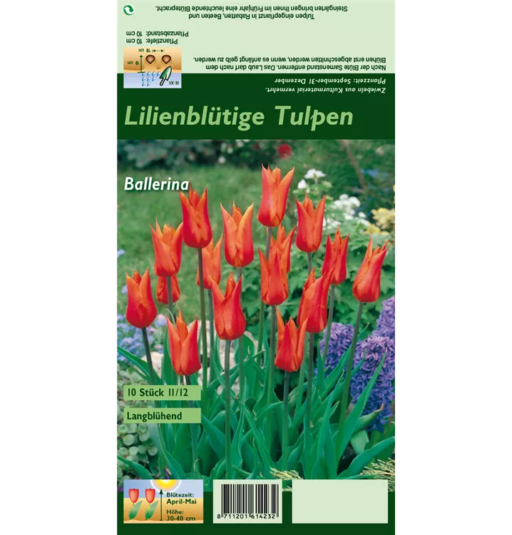 Welch eine Pracht, wenn die Lilienblütige Tulpe 'Ballerina' ab April ihre herrlichen, orangefarbenen Blüten hervorbringt! Das Besondere: sie verbreiten einen angenehmen Duft. Über den dunkelgrünen, linealen Blättern kommen die Blüten besonders gut zur Geltung. Wird Tulipa 'Ballerina' an einen sonnigen Standort mit durchlässigem, lockerem und nährstoffreichem Boden gepflanzt, entwickelt sie sich besonders gut. Sie wächst aufrecht, schlank und erreicht Größen von 35 cm bis 45 cm bei einer Breite von 8 cm bis 10 cm. Sehr dekorativ macht sich die Lilienblütige Tulpe 'Ballerina' auch in Kübeln oder Kästen.