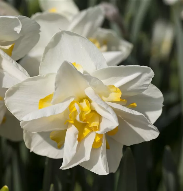 Zwischen März und April lässt die Narzisse 'White Lion' ihre gefüllten Blüten in Weiß-gelb erstrahlen und ihren angenehmen Duft verbreiten. Die radförmigen oder röhrenförmigen Blüten sind in Trauben angeordnet.