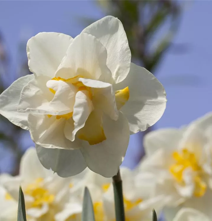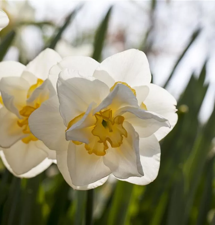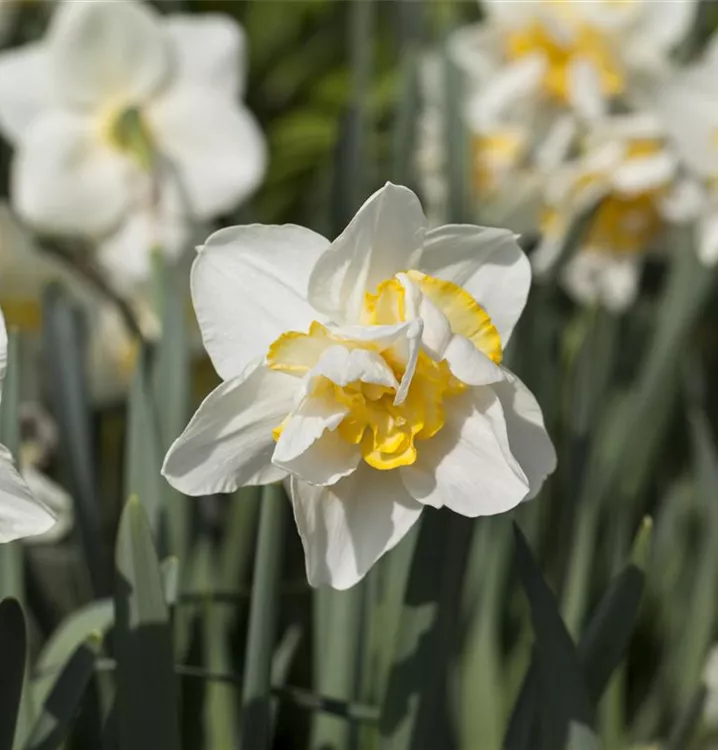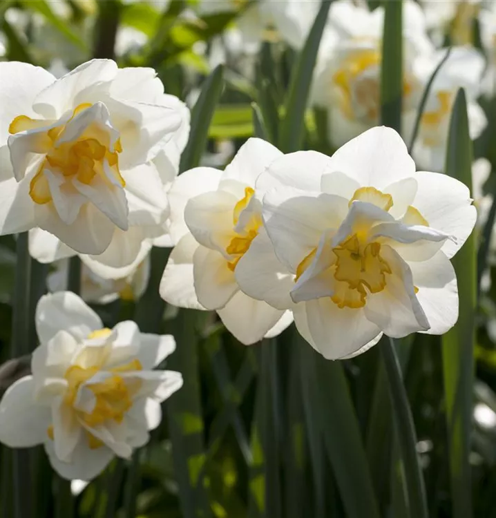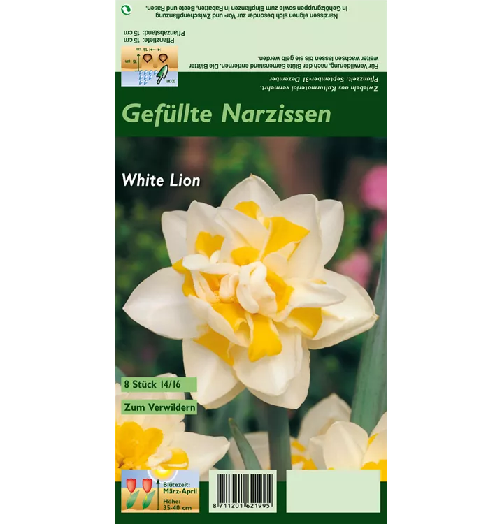 Welch eine Pracht, wenn die Narzisse 'White Lion' ab März ihre herrlichen, weiß-gelben, radförmigen oder röhrenförmigen Blüten hervorbringt! Das Besondere: sie sind gefüllt und verbreiten einen angenehmen Duft. Über den dunkelgrünen, linealen Blättern kommen die Blüten besonders gut zur Geltung. Wird Narcissus 'White Lion' an einen sonnigen Standort mit durchlässigem, lockerem und nährstoffreichem Boden gepflanzt, entwickelt sie sich besonders gut. Sie wächst aufrecht und erreicht Größen von 35 cm bis 40 cm bei einer Breite von 10 cm bis 15 cm. Sehr dekorativ macht sich die Narzisse 'White Lion' auch in Kübeln oder Kästen.
