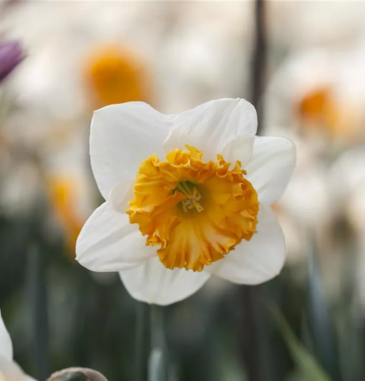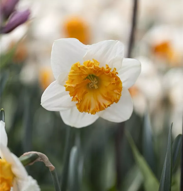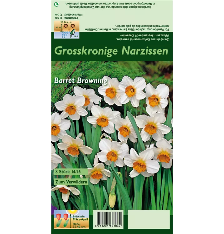 Welch eine Pracht, wenn die Narzisse 'Barrett Browning' ab März ihre herrlichen, weiß-orangefarbenen, radförmigen oder röhrenförmigen Blüten hervorbringt! Das Besondere: sie verbreiten einen angenehmen Duft. Über den dunkelgrünen, linealen Blättern kommen die Blüten besonders gut zur Geltung. Wird Narcissus 'Barrett Browning' an einen sonnigen Standort mit durchlässigem, lockerem und nährstoffreichem Boden gepflanzt, entwickelt sie sich besonders gut. Sie wächst aufrecht und erreicht Größen von 35 cm bis 45 cm bei einer Breite von 10 cm bis 15 cm. Sehr dekorativ macht sich die Narzisse 'Barrett Browning' auch in Kübeln oder Kästen.