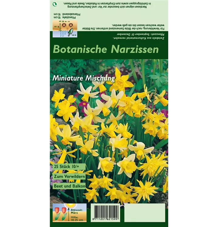 Welch eine Pracht, wenn die Narzisse 'Botanische Mischung' ab März ihre herrlichen, weißen, gelben bis orangefarbenen, radförmigen oder röhrenförmigen Blüten hervorbringt! Das Besondere: sie verbreiten einen angenehmen Duft. Über den dunkelgrünen, linealen Blättern kommen die Blüten besonders gut zur Geltung. Wird Narcissus, botanisch an einen sonnigen Standort mit durchlässigem, lockerem und nährstoffreichem Boden gepflanzt, entwickelt sie sich besonders gut. Sie wächst kompakt und erreicht Größen von 10 cm bis 25 cm bei einer Breite von 8 cm bis 15 cm. Sehr dekorativ macht sich die Narzisse 'Botanische Mischung' auch in Kübeln oder Kästen.