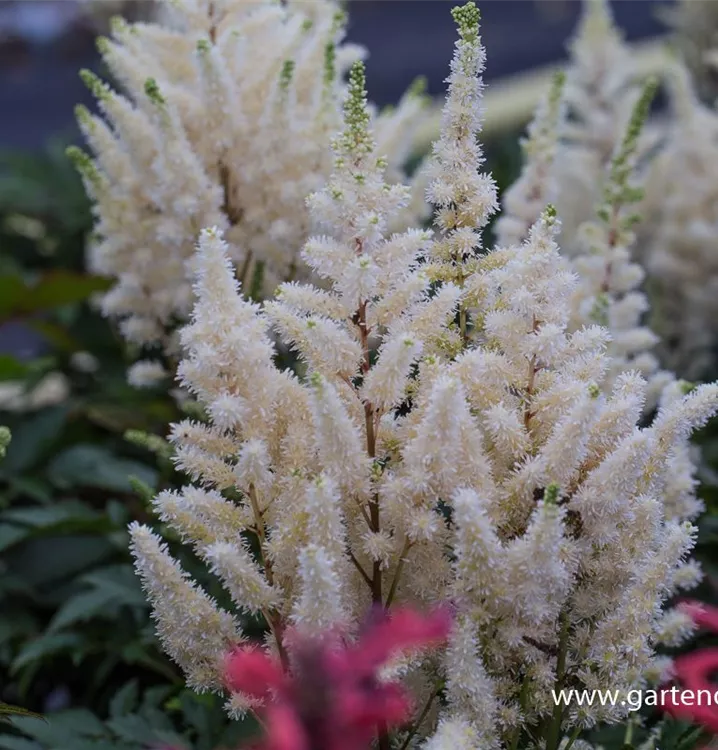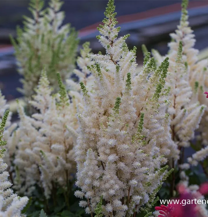 Astilbe japonica 'Younique White'® bildet in Rispen angeordnete, weiße Blüten ab Juni.