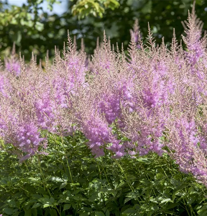 Astilbe japonica 'Younique Lilac'® bildet in Rispen angeordnete, rosafarbene Blüten ab Juni.