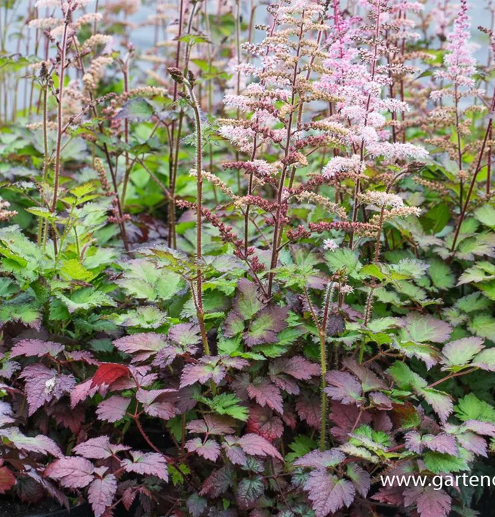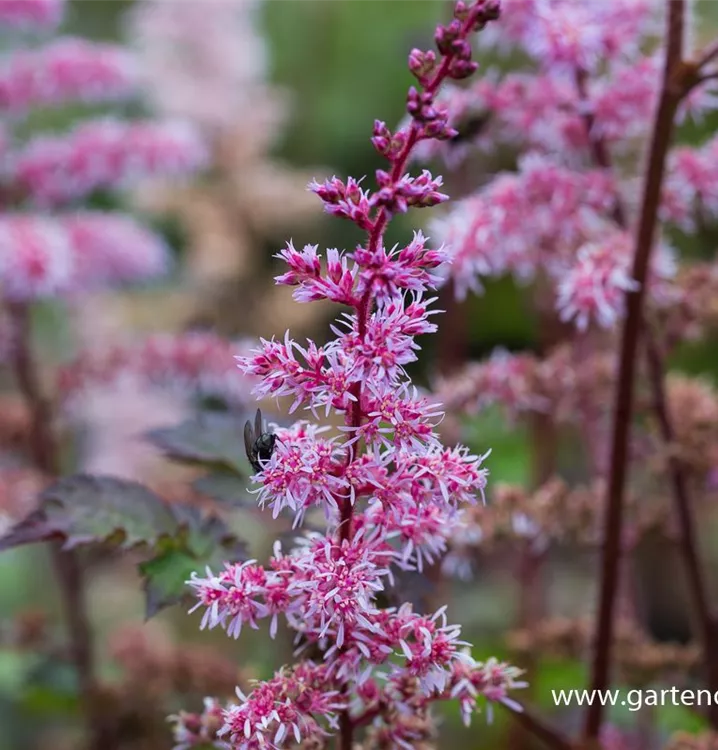 Astilbe 'Colour Flash' bildet in Rispen angeordnete, rosarote Blüten ab Juli.