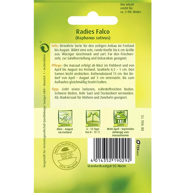 Das Radieschen 'Falco' (Raphanus sativus var. sativus) bildet Knollen, die aromatisch schmecken und bereits von Mai bis September geerntet werden können. Für das optimale Wachstum des Radieschens 'Falco' werden ein sonniger Standort und durchlässiger, nährstoffreicher Boden benötigt.
