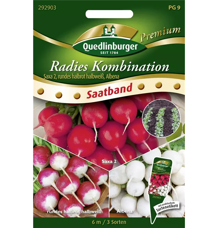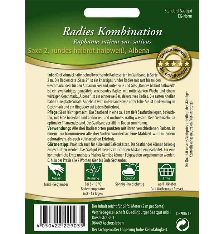 Die Radieschen-Kombination (Raphanus sativus var. sativus) bildet Knollen, die aromatisch schmecken und bereits ab Juni geerntet werden können. Für das optimale Wachstum der Radieschen-Kombination werden ein sonniger Standort und durchlässiger, nährstoffreicher Boden benötigt.