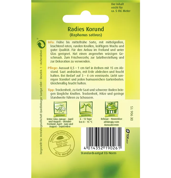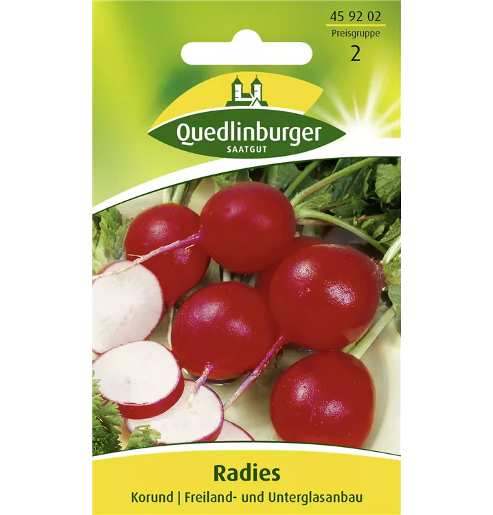 Das Radieschen 'Korund' (Raphanus sativus var. sativus) bildet mittelgroße Knollen, die aromatisch schmecken und bereits ab Juni geerntet werden können. Für das optimale Wachstum des Radieschens 'Korund' werden ein sonniger Standort und durchlässiger, nährstoffreicher Boden benötigt.