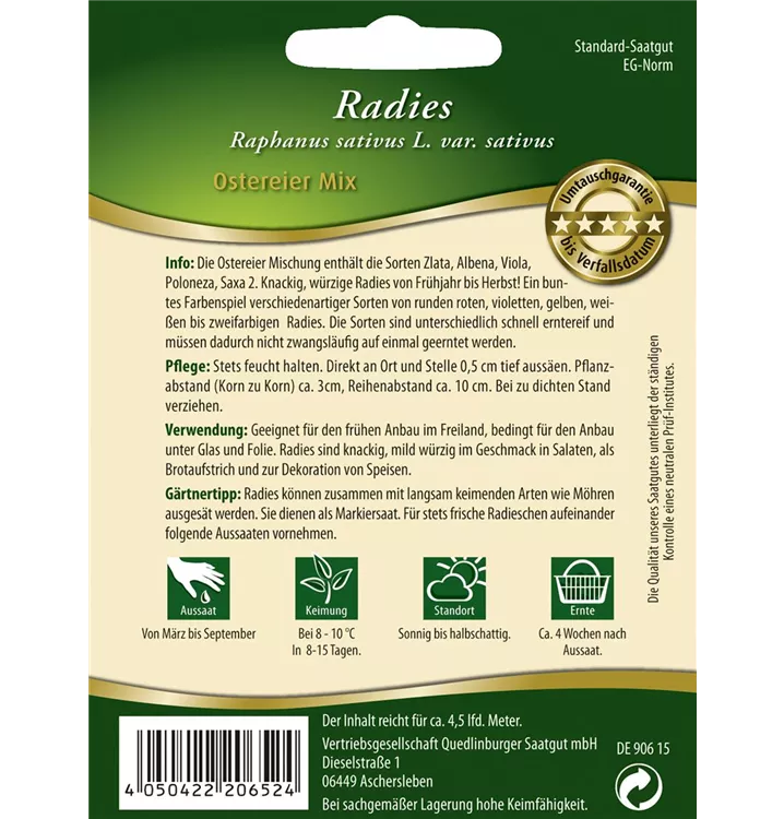 Das Radieschen 'Ostereier Mischung' (Raphanus sativus var. sativus) bildet Knollen, die aromatisch schmecken und bereits ab Juni geerntet werden können. Für das optimale Wachstum des Radieschens 'Ostereier Mischung' werden ein sonniger Standort und durchlässiger, nährstoffreicher Boden benötigt.