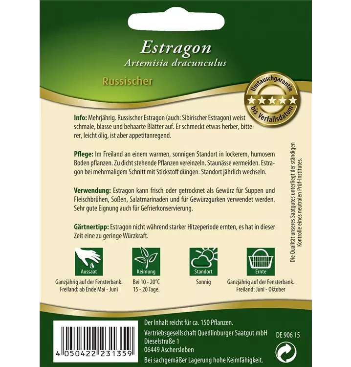Der Rusischer Estragon (Artemisia dracunculus) ist eine Kräuterpflanze mit einem würzigen Geschmack. Seine mittelgrünen Blätter sind gefingert. Für das optimale Wachstum des Rusischer Estragons werden ein sonniger Standort und durchlässiger, nährstoffreicher Boden benötigt.