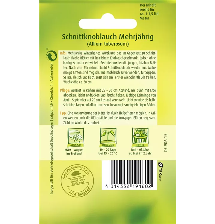 Der Schnittknoblauch (Allium tuberosum) ist eine würzig schmeckende Gemüsepflanze. Seine Blätter können geerntet werden, sobald er ca. 20 erreicht hat. Für das optimale Wachstum des Schnittknoblauchs werden ein sonniger Standort und durchlässiger, nährstoffreicher Boden benötigt.