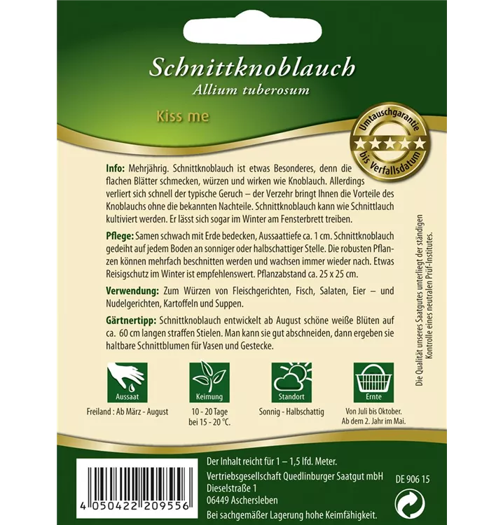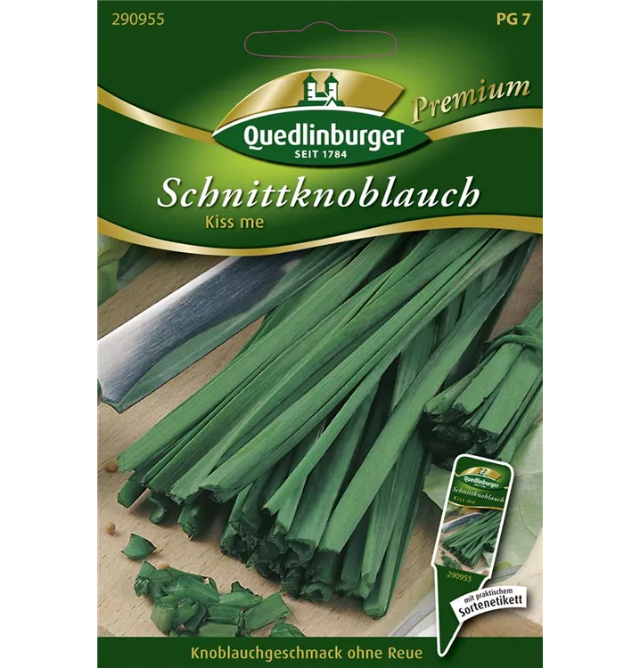 Der Schnittknoblauch 'Kiss Me' (Allium tuberosum) ist eine würzig schmeckende Gemüsepflanze. Seine Blätter können geerntet werden, sobald er ca. 20 erreicht hat. Für das optimale Wachstum des Schnittknoblauchs 'Kiss Me' werden ein sonniger Standort und durchlässiger, nährstoffreicher Boden benötigt.