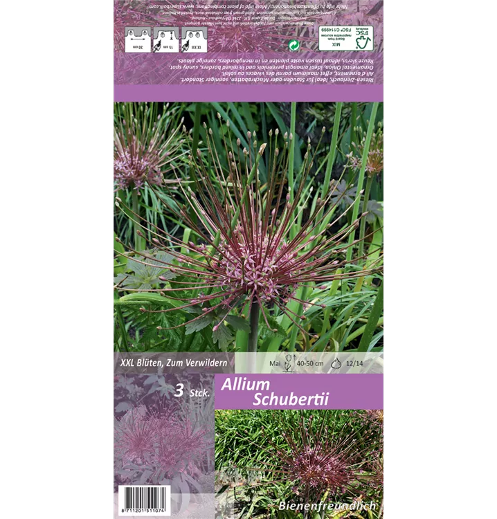 Welch eine Pracht, wenn der Schuberts Zier-Lauch ab Mai seine herrlichen, violetten Blüten hervorbringt! Über den dunkelgrünen, lanzettlichen Blättern kommen die Blüten besonders gut zur Geltung. Wird Allium schubertii an einen sonnigen Standort mit durchlässigem, humosem und nährstoffreichem Boden gepflanzt, entwickelt er sich besonders gut. Er wächst aufrecht und erreicht Größen von 40 cm bis 50 cm bei einer Breite von 8 cm bis 10 cm. Sehr dekorativ macht sich der Schuberts Zier-Lauch auch in Kübeln oder Kästen.