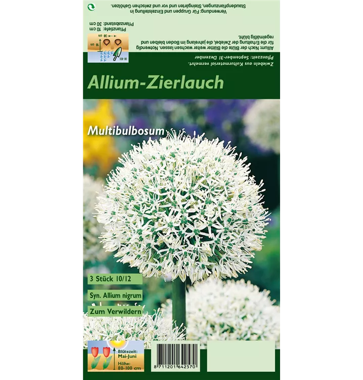 Welch eine Pracht, wenn der Schwarze Lauch ab Mai seine herrlichen, weißen, ballförmigen Blüten hervorbringt! Über den dunkelgrünen, linealen Blättern kommen die Blüten besonders gut zur Geltung. Wird Allium nigrum an einen sonnigen Standort mit durchlässigem, humosem und nährstoffreichem Boden gepflanzt, entwickelt er sich besonders gut. Er wächst aufrecht und erreicht Größen von 80 cm bis 1 m bei einer Breite von 15 cm bis 20 cm.