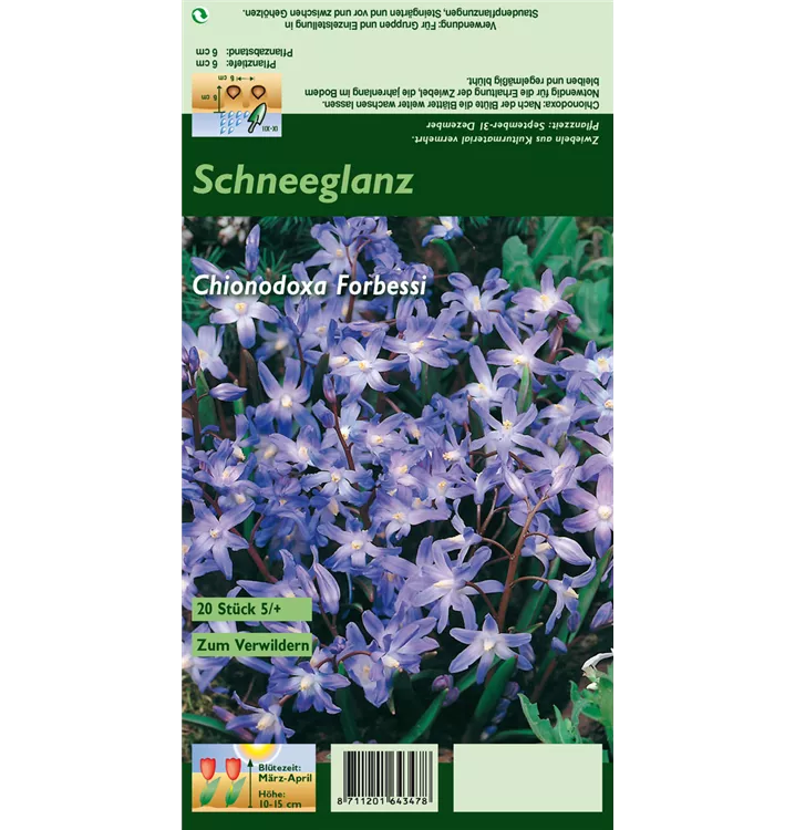 Welch eine Pracht, wenn der Schneeglanz ab März seine herrlichen, blauen Blüten hervorbringt! Über den dunkelgrünen, lanzettlichen Blättern kommen die Blüten besonders gut zur Geltung. Wird Chionodoxa forbesii an einen sonnigen bis halbschattigen Standort mit durchlässigem Boden gepflanzt, entwickelt er sich besonders gut. Ererreicht Größen von 10 cm bis 15 cm bei einer Breite von 5 cm bis 10 cm. Sehr dekorativ macht sich der Schneeglanz auch in Kübeln oder Kästen.