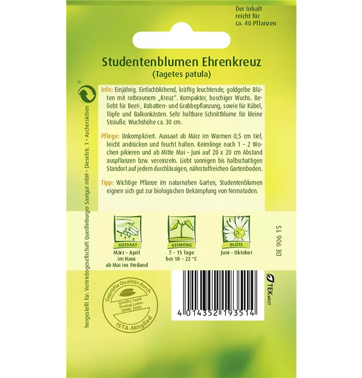Die Studentenblume 'Ehrenkreuz' ist als Kübelpflanze, aber auch als Schnittpflanze, als Grabbepflanzung, als Beeteinfassung, auf Balkon oder Terrasse oder in Klein- und Vorgärten sehr beliebt.
