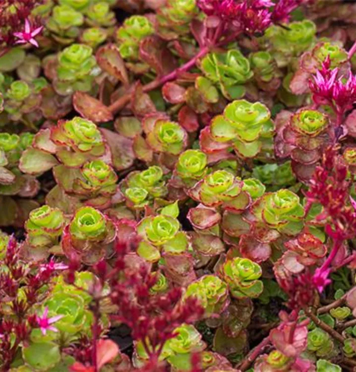 Das Garten-Teppich-Fettblatt 'Coccineum' (Sedum spurium) ist eine teppichartige wintergrüne Staude, die von Juni bis Juli dunkelrosafarbene, in Dolden angeordnete Blüten bildet. An einem sonnigen, windgeschützten Standort mit durchlässigem, nährstoffreichem Boden erreicht es gewöhnlich eine Höhe von ca. 10 cm und wird ca. 20 cm breit. Das Garten-Teppich-Fettblatt 'Coccineum' ist gut frostverträglich.