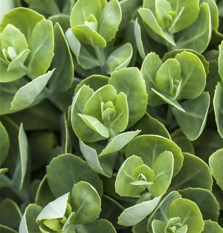 Die wintergrünen Blätter des Garten-Teppich-Fettblatts 'Coccineum' sind dunkelgrün, dickfleischig.