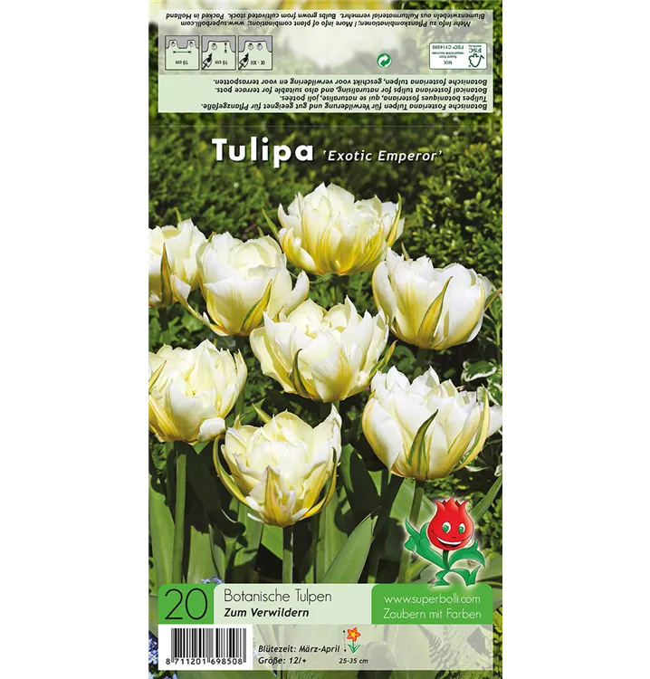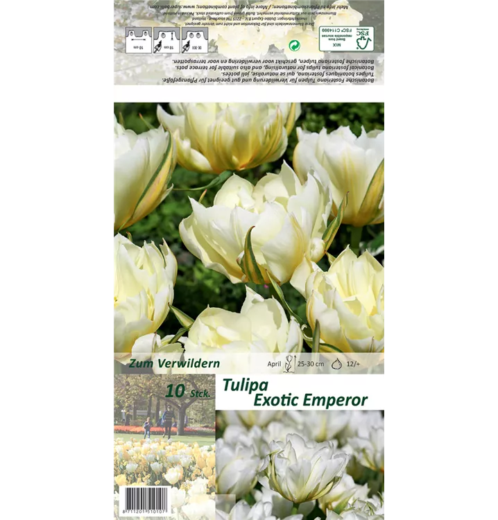 Welch eine Pracht, wenn die Tulpe 'Exotic Emperor' ab März ihre herrlichen, weißen Blüten hervorbringt! Das Besondere: sie verbreiten einen angenehmen Duft. Über den dunkelgrünen, linealen Blättern kommen die Blüten besonders gut zur Geltung. Wird Tulipa fosteriana 'Exotic Emperor' an einen sonnigen Standort mit durchlässigem, lockerem und nährstoffreichem Boden gepflanzt, entwickelt sie sich besonders gut. Sie wächst aufrecht, schlank und erreicht Größen von 25 cm bis 35 cm bei einer Breite von 10 cm bis 12 cm. Sehr dekorativ macht sich die Tulpe 'Exotic Emperor' auch in Kübeln oder Kästen.