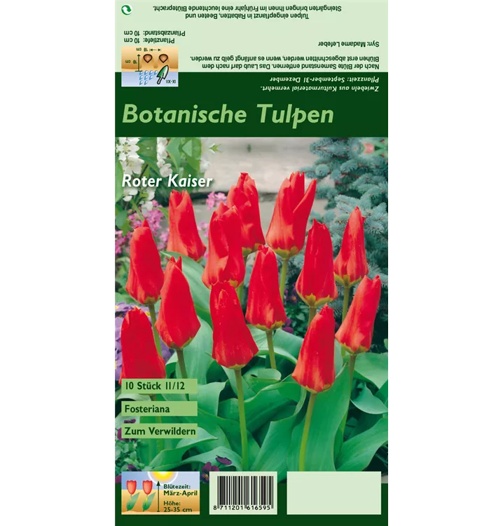 Welch eine Pracht, wenn die Tulpe 'Roter Kaiser' ab März ihre herrlichen, roten Blüten hervorbringt! Das Besondere: sie verbreiten einen angenehmen Duft. Über den dunkelgrünen, linealen Blättern kommen die Blüten besonders gut zur Geltung. Wird Tulipa fosteriana 'Roter Kaiser' an einen sonnigen Standort mit durchlässigem, lockerem und nährstoffreichem Boden gepflanzt, entwickelt sie sich besonders gut. Sie wächst aufrecht, schlank und erreicht Größen von 25 cm bis 35 cm bei einer Breite von 10 cm bis 12 cm. Sehr dekorativ macht sich die Tulpe 'Roter Kaiser' auch in Kübeln oder Kästen.