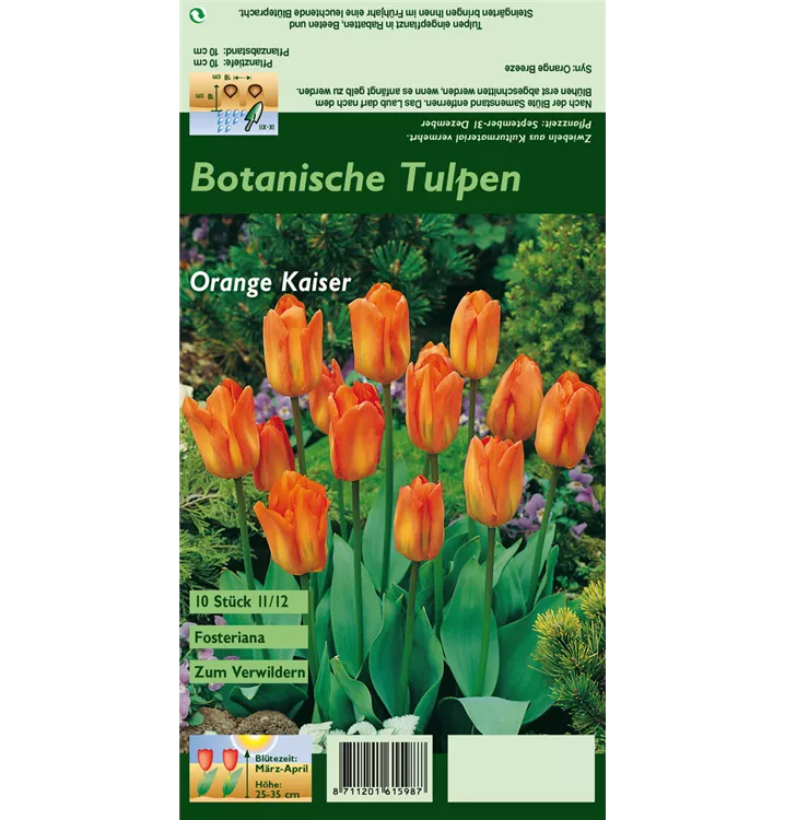Welch eine Pracht, wenn die Tulpe 'Oranger Kaiser' ab März ihre herrlichen, orangefarbenen Blüten hervorbringt! Das Besondere: sie verbreiten einen angenehmen Duft. Über den dunkelgrünen, linealen Blättern kommen die Blüten besonders gut zur Geltung. Wird Tulipa fosteriana 'Oranger Kaiser' an einen sonnigen Standort mit durchlässigem, lockerem und nährstoffreichem Boden gepflanzt, entwickelt sie sich besonders gut. Sie wächst aufrecht, schlank und erreicht Größen von 25 cm bis 35 cm bei einer Breite von 10 cm bis 12 cm. Sehr dekorativ macht sich die Tulpe 'Oranger Kaiser' auch in Kübeln oder Kästen.