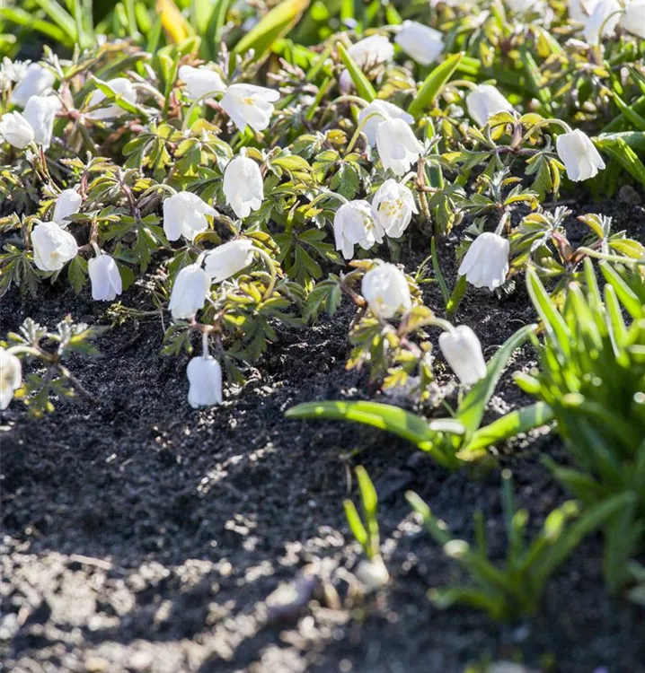 Pulsatilla vulgaris 'Alba' bildet glockenförmige, weiße Blüten ab März.