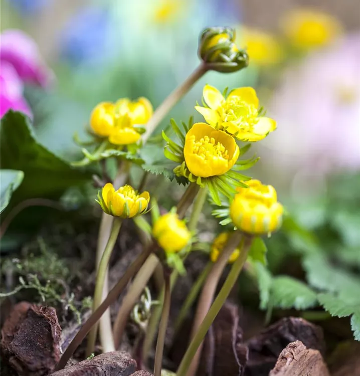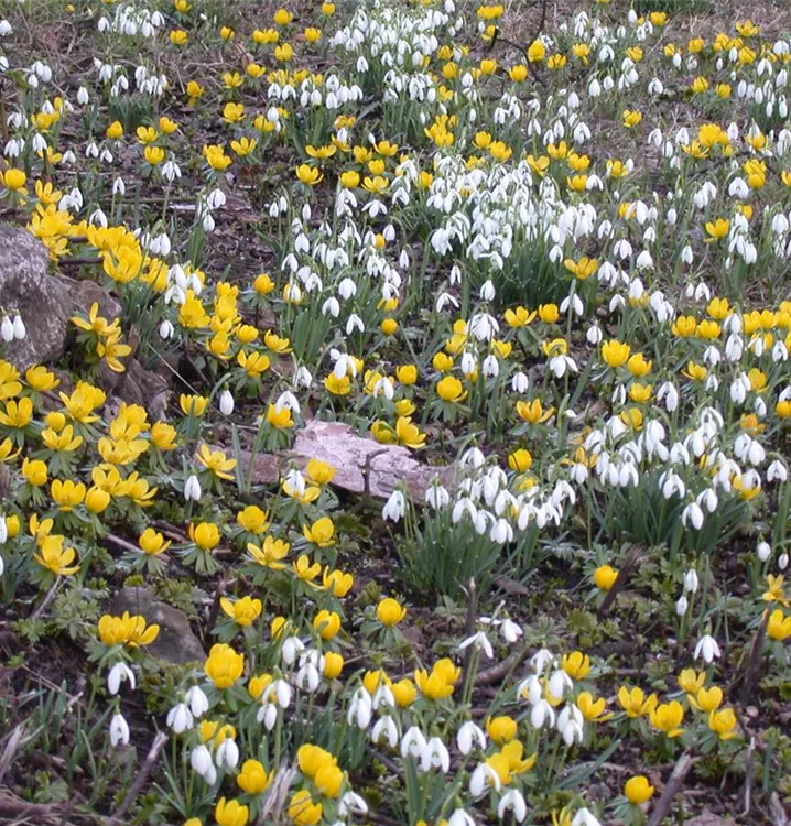 Zusammengepflanzt mit Frühlings-Knotenblume, Sibirischer Blaustern und Kleines Schneeglöckchen bildet der Winterling einen harmonischen Anblick.