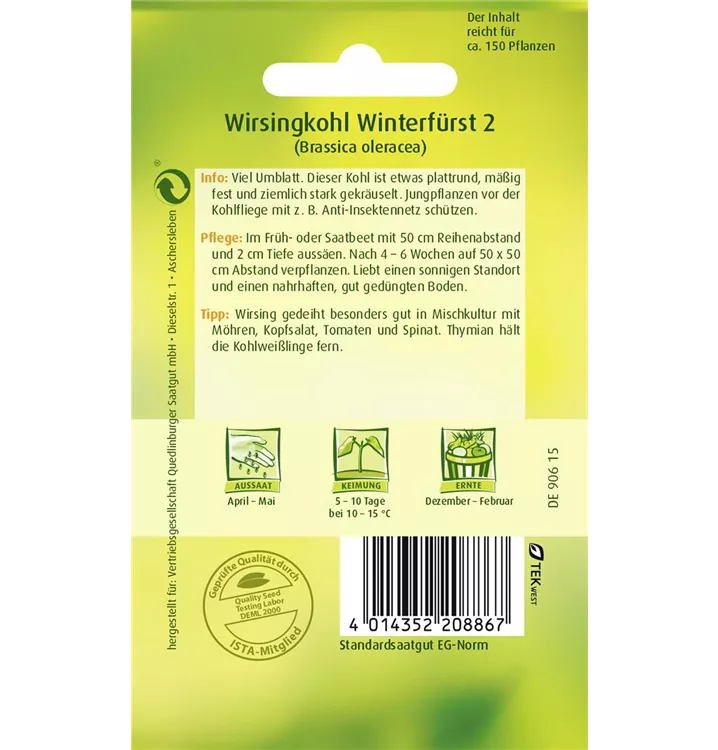 Der Wirsingkohl 'Winterfürst 2' (Brassica oleracea var. capitata) ist eine aromatisch schmeckende Gemüsepflanze. Seine Blätter können geerntet werden, sobald er ca. 40 erreicht hat. Für das optimale Wachstum des Wirsingkohls 'Winterfürst 2' werden ein sonniger Standort und durchlässiger, nährstoffreicher Boden benötigt.