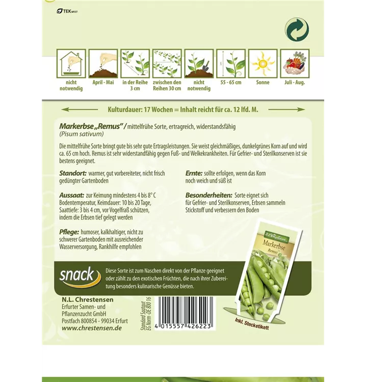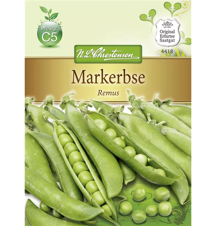Die Markerbse 'Remus' (Pisum sativum) bildet Samenkörner, die süß, aromatisch schmecken und bereits ab Juli geerntet werden können. Für das optimale Wachstum der Markerbse 'Remus' werden ein sonniger Standort und durchlässiger, nährstoffreicher Boden benötigt.