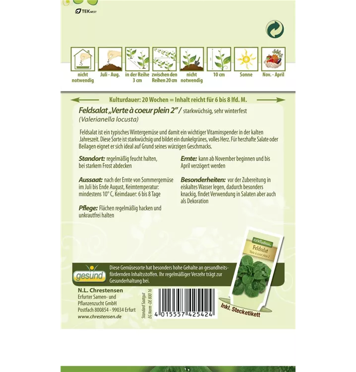 Der Feldsalat 'Verte a coeur plein' (Valerianella locusta) ist eine aromatisch, nussig schmeckende Gemüsepflanze. Seine Blätter können geerntet werden, sobald er ca. 10 erreicht hat. Für das optimale Wachstum des Feldsalats 'Verte a coeur plein' werden ein sonniger Standort und durchlässiger, nährstoffreicher Boden benötigt.