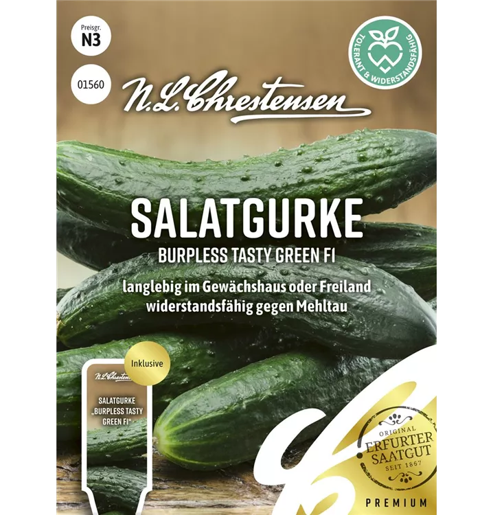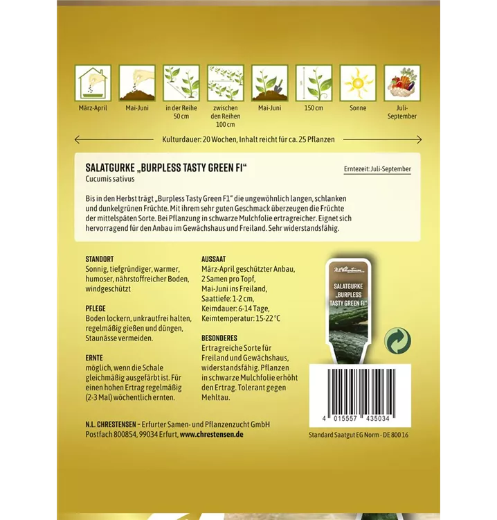 Die Gurke 'Burpless Tasty Green F1' (Cucumis sativus) bildet Früchte, die aromatisch schmecken und bereits ab Juni geerntet werden können. Für das optimale Wachstum der Gurke 'Burpless Tasty Green F1' werden ein sonniger Standort und durchlässiger, nährstoffreicher Boden benötigt.
