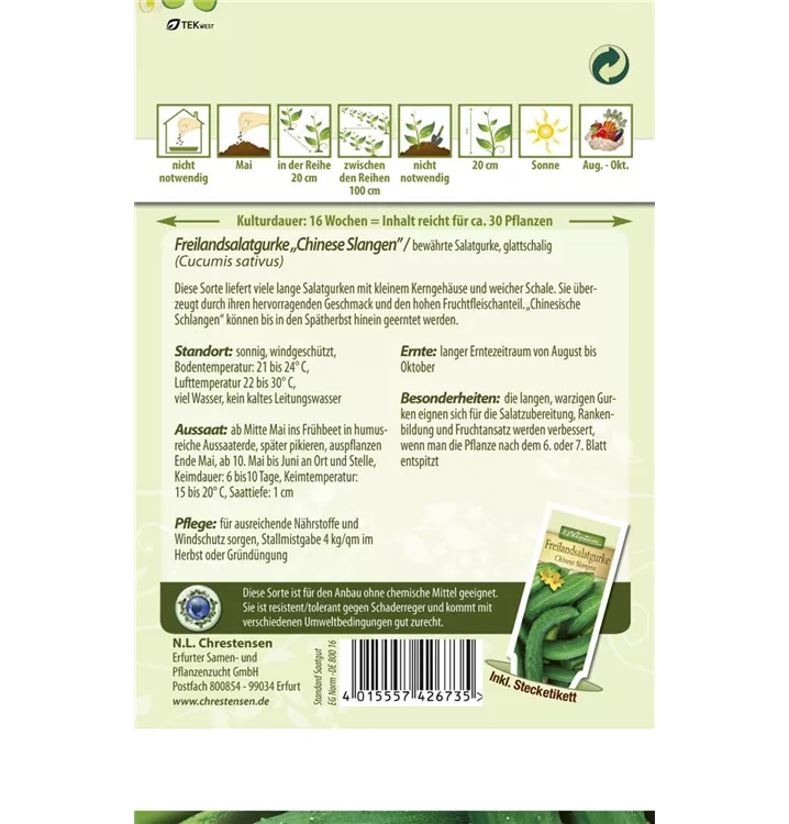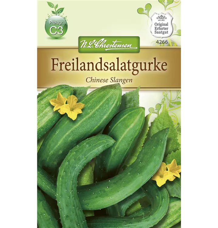 Die Gurke 'Chinese Slangen' (Cucumis sativus) bildet Früchte, die aromatisch schmecken und bereits ab August geerntet werden können. Für das optimale Wachstum der Gurke 'Chinese Slangen' werden ein sonniger Standort und durchlässiger, nährstoffreicher Boden benötigt.
