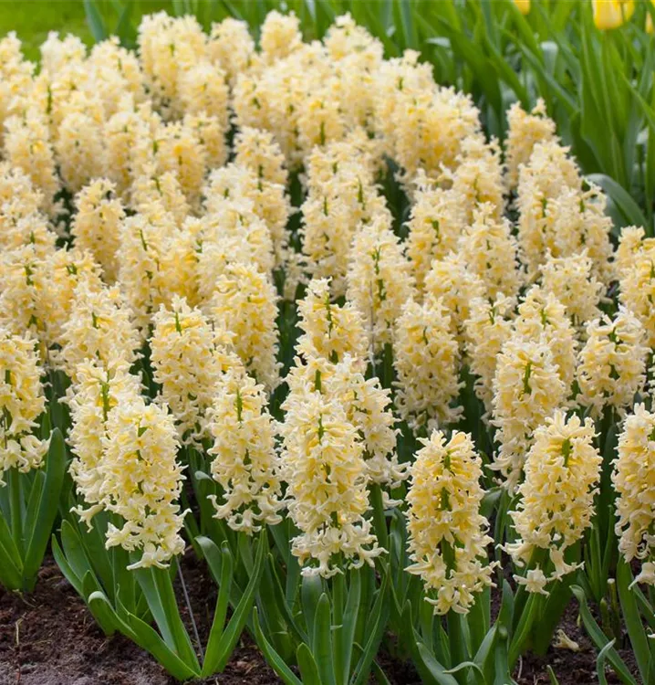 Die Hyazinthe 'Yellow Queen' (Hyacinthus orientalis) ist eine pflegeleichte Pflanze, die weiß, rosa, lila, blau, hellgelb blüht. Die trichterförmigen Blüten verströmen einen angenehmen Duft und erscheinen von April bis Mai in Trauben angeordnet. Bevorzugt wird ein sonniger bis halbschattiger Standort.