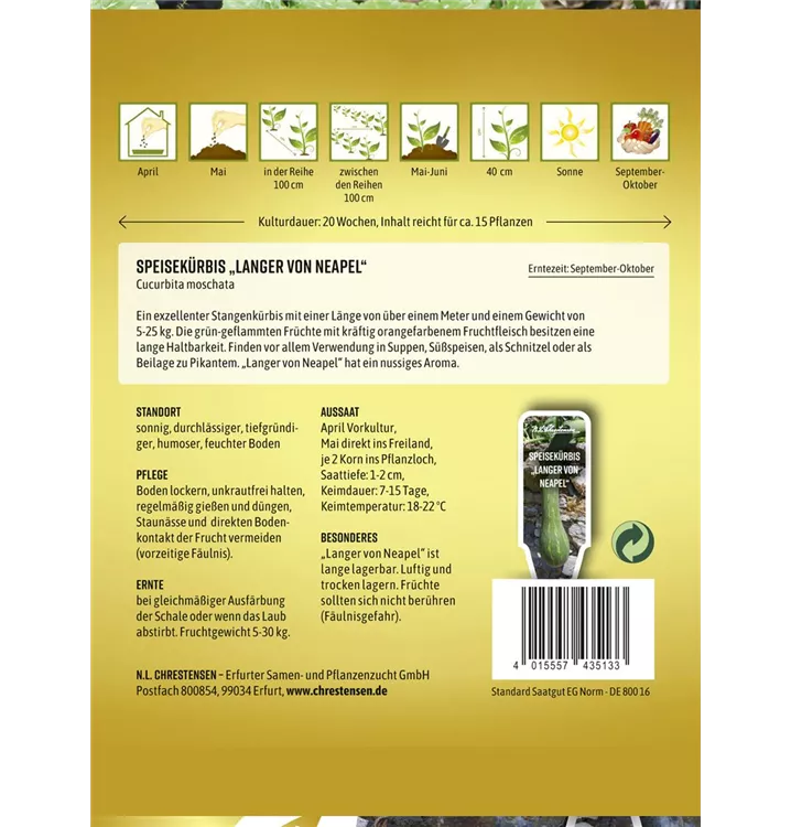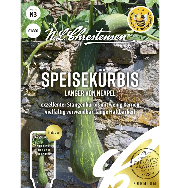 Der Moschus-Kürbis 'Langer von Neapel' ist im Gemüsegarten, aber auch für Marmeladen & Gelee, zum Backen, zum Kochen, für Süßspeisen oder zur Dekoration sehr beliebt.