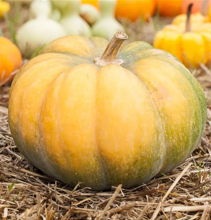Der Moschus-Kürbis 'Muscat de Provence' (Cucurbita moschata) bildet Früchte, die süß, nussig schmecken und bereits ab September geerntet werden können. Für das optimale Wachstum des Moschus-Kürbises 'Muscat de Provence' werden ein sonniger Standort und durchlässiger, nährstoffreicher Boden benötigt.