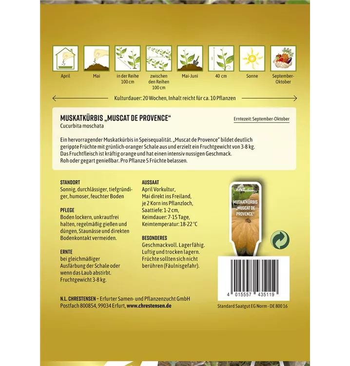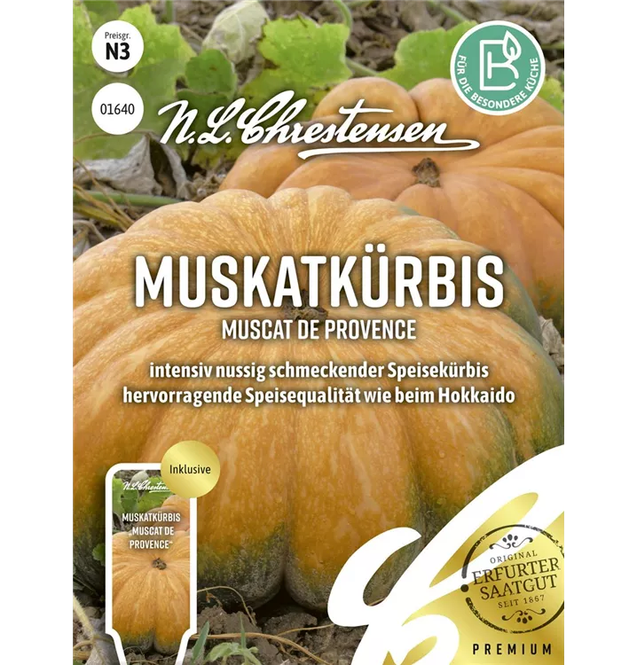 Der Moschus-Kürbis 'Muscat de Provence' ist im Gemüsegarten, aber auch für Marmeladen & Gelee, zum Backen, zum Kochen, für Süßspeisen, zur Dekoration oder zum Verzehr sehr beliebt.
