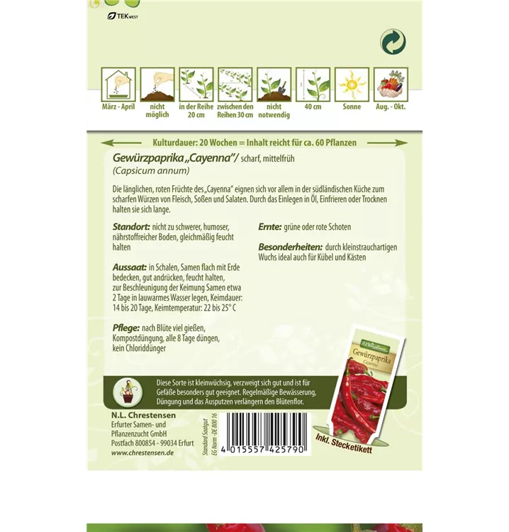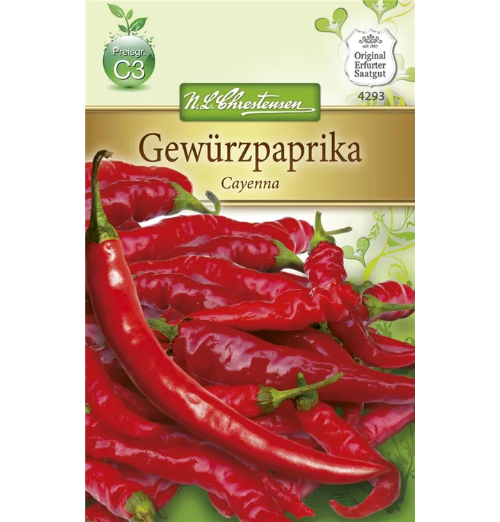 Der Paprika 'Gewürzpfeffer Cayenna' (Capsicum annuum) bildet Früchte, die würzig, scharf schmecken und bereits ab August geerntet werden können. Für das optimale Wachstum des Paprikas 'Gewürzpfeffer Cayenna' werden ein sonniger Standort und durchlässiger, nährstoffreicher Boden benötigt.
