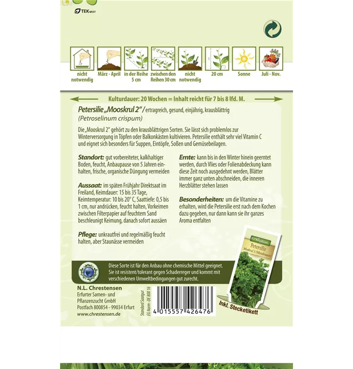 Die Krause Petersilie 'Mooskrause 2' (Petroselinum crispum) ist eine Kräuterpflanze mit einem aromatischen, würzigen Geschmack. Ihre dunkelgrünen Blätter sind gefiedert und gewellt. Für das optimale Wachstum der Krause Petersilie 'Mooskrause 2' werden ein sonniger Standort und durchlässiger, nährstoffreicher Boden benötigt.