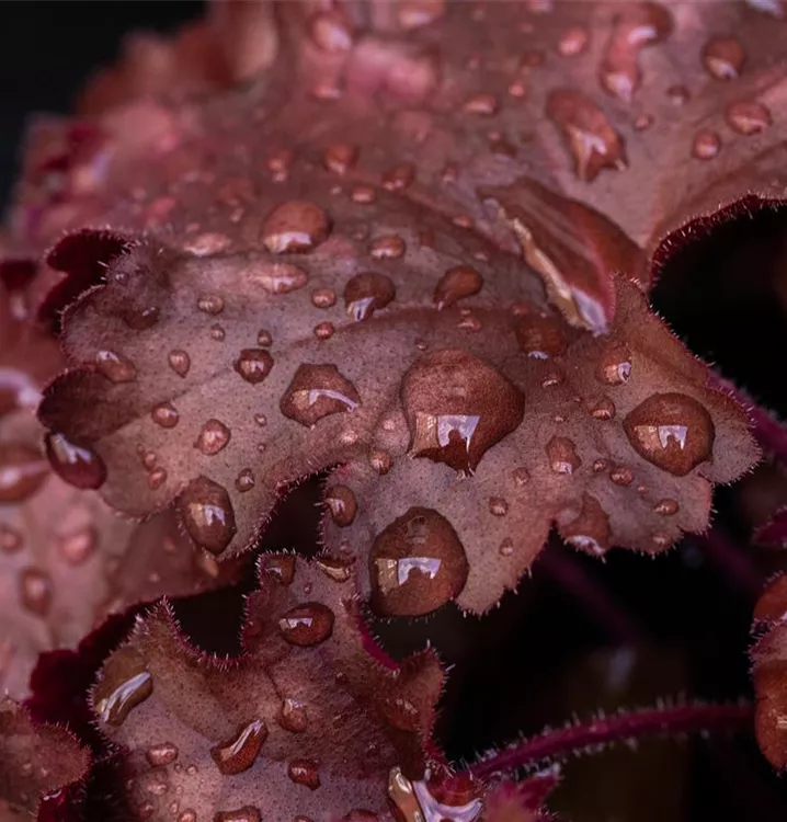 Hoher Blattschmuckwert. Die wintergrünen Blätter des Purpurglöckchens 'Chateau Rouge' sind dunkelrot, rot-braun geädert, herzförmig, gebuchtet.