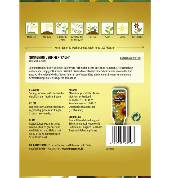 Der Raue Garten-Sonnenhut 'Sommertraum' (Rudbeckia hirta) ist eine buschige, rhizombildende Staude, die von Mai bis September gelbe, radförmige, in Trauben angeordnete Blüten bildet. An einem sonnigen bis halbschattigen Standort mit durchlässigem, nährstoffreichem Boden erreicht er gewöhnlich eine Höhe von ca. 1 m und wird ca. 60 cm breit. Der Raue Garten-Sonnenhut 'Sommertraum' ist gut frostverträglich.