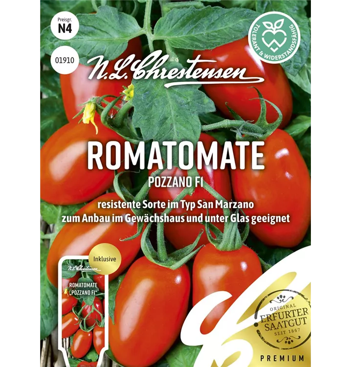 Die Tomate 'Pozzano' (Solanum lycopersicum) bildet Früchte, die aromatisch schmecken und bereits ab Juli geerntet werden können. Für das optimale Wachstum der Tomate 'Pozzano' werden ein sonniger Standort und durchlässiger, nährstoffreicher Boden benötigt.